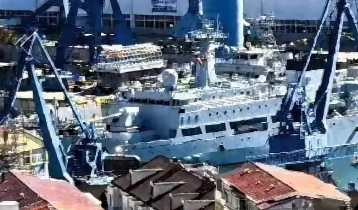 Le canon est installé sur la proue d’un navire d’essai au chantier naval de Liaonan, à Dalian, dans la province du Liaoning, au nord-est de la Chine. Il illustre une avancée technologique visant à augmenter la capacité d’attaque terrestre de la Marine de la PLA (PLAN) avec un canon électrique innovant.