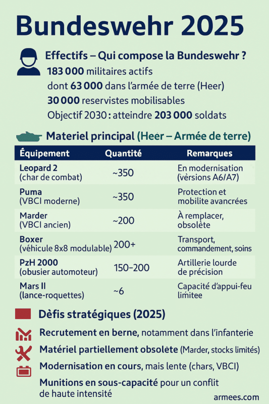 La Heer représente la composante terrestre de la Bundeswehr et joue un rôle central dans la défense du territoire national et dans les opérations internationales. Cependant, elle fait face à des défis importants en matière de recrutement, de maintenance de son équipement et de modernisation. Voici un état des lieux détaillé des capacités de la Heer, avec les chiffres clés pour chaque domaine.